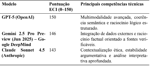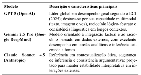 A escolha dos modelos considerou dois critérios principais: (a) capacidade técnica global, medida pelo Epoch Capabilities Index (ECI); e (b) relevância social e adoção nacional, conforme Pacete (2025), que aponta ChatGPT, Gemini e Claude como as mais utilizadas no Brasil. O Epoch Capabilities Index (ECI) é um índice desenvolvido pela organização Epoch AÍ para comparar a capacidade geral de modelos de linguagem de grande escala, em uma escala de 0 a 150 pontos, na qual o modelo de referência (GPT-5) recebe a pontuação máxima. Esse índice agrega o desempenho dos modelos em múltiplas tarefas de raciocínio, compreensão e geração textual, funcionando como uma métrica sintética de maturidade técnica (EPOCHAI,2025). Neste Artigo, o ECI é utilizado apenas para caracterizar a capacidade técnica global dos modelos incluídos no experimento, com base nos valores disponíveis em 4 nov. 2025.