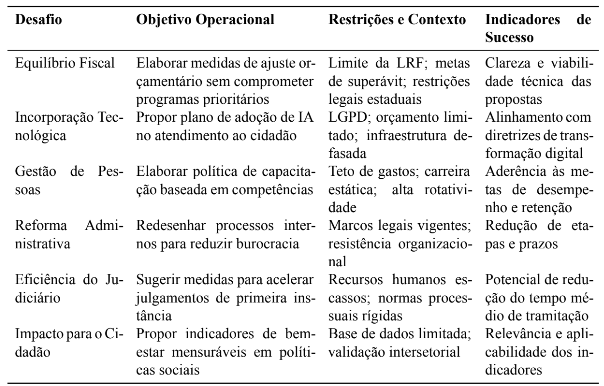 Com base nos seis desafios propostos por Falconi et al. (2023), foram formulados seis casos simulados representativos de situações administrativas reais. Cada caso busca reproduzir um problema concreto de gestão pública, contendo três componentes essenciais: (i) objetivo operacional; (ii) restrições institucionais; e (iii) indicadores de sucesso.