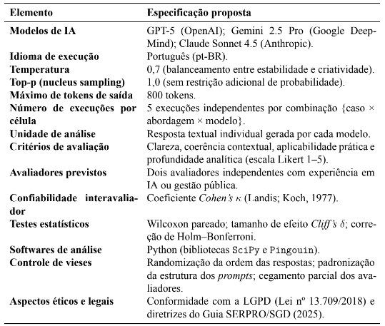 Essas distinções fundamentam a análise comparativa proposta neste estudo, cujo foco é compreender a performance de ambas as abordagens em cenários simulados da administração pública brasileira. A próxima seção detalha o delineamento metodológico e as estratégias utilizadas para coleta e análise das respostas produzidas pelos modelos de IA.