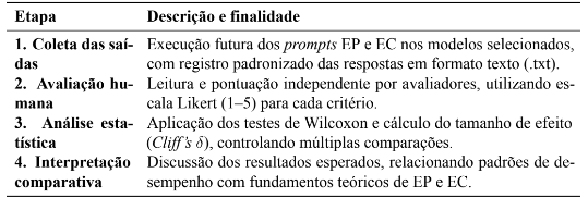 (5) Execução experimental: submissão dos conjuntos de entradas a três modelos de IA, sob condições constantes de idioma, temperatura e formato de resposta;