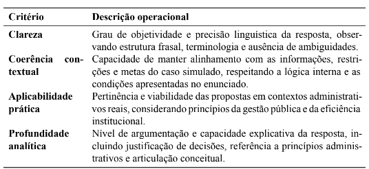 A estrutura textual deve ser coesa, formal e padronizada, empregando linguagem técnica e impessoal, com foco na viabilidade e mensurabilidade das ações. A extensão final deve limitar aproximadamente 350 palavras, parâmetro definido para assegurar comparação metodológica entre os casos experimentais, equilíbrio na densidade contextual e coerência analítica no conjunto dos instrumentos avaliados.