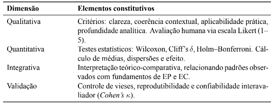 (6) Coleta e análise: organização dos resultados em planilha de coleta padronizada, seguida de avaliação qualitativa e quantitativa segundo critérios de clareza, coerência, aplicabilidade e profundidade.