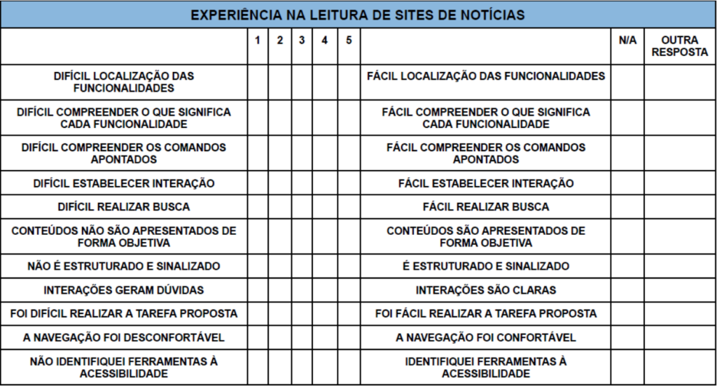 O artigo de Lima et al. (2022), teve como objetivo avaliar a UX em relação aos portais de notícias mais lidos do país (G1, R7, Metrópoles, UOL Notícias e Terra. Para o teste, usaram a ferramenta Tracking Techniques Based User Experience Evaluation Tool (T2-UXT) e compararam as opiniões dos voluntários por meio do Teste QUIS (Figura 1), que foi adaptado a partir das heurísticas de Renzi et al. (2016).