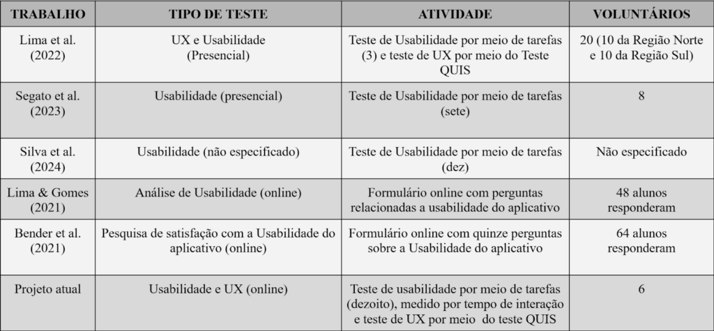 Já o trabalho de Segato et al. (2023), mostra os resultados do teste de usabilidade do protótipo de aplicativo para ajudar na identificação de áreas para a produção de mel que atenda às exigências da regulamentação. O teste foi realizado presencialmente e contou com oito voluntários que trabalham na produção de mel. Primeiro, por meio de vídeo explicaram o projeto, depois aplicaram um questionário para obterem maiores informações sobre os participantes e suas produções. Por fim, o teste de usabilidade onde definiram cenários realistas e tarefas específicas, no total foram sete tarefas que registraram em vídeo. O objetivo do teste foi avaliar o design visual, navegação e as informações e mediram a eficácia da tarefa por meio de cliques.