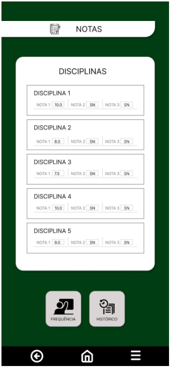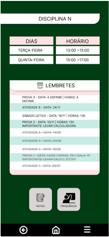 A tela de disciplina, mostra os horários e lembretes de informações importantes referentes a matéria. A tela de Mural contém as categorias disponíveis Estágio, Extracurricular, Institucional e Outros; Na tela de frequência a porcentagem indica a quantidade de aulas já lecionadas, a barra verde são presenças, a vermelha representa faltas e o cinza mostra as aulas que ainda serão lecionadas; A tela de notas mostra as três principais e SN significa Sem Nota ainda. A tela de postagem no mural, onde é possível curtir ou reportar a publicação, quando a ação de ‘Curtir’ ou ‘Reportar’ é feita, o símbolo muda informando ao usuário sobre a ação realizada.
