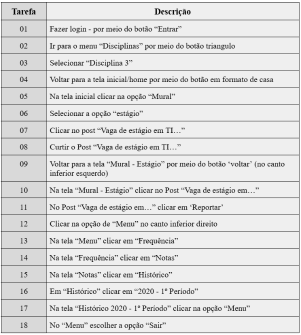 O teste foi feito por meio da plataforma Figma, de forma online, onde as instruções (tarefas Quadro 2) eram passadas ao voluntário e ele repetia no aplicativo. O teste contou com a participação de seis voluntários. Por ser de forma não presencial, os alunos escolhiam o eletrônico, três participantes fizeram pelo smartphone e os outros pelo notebook.