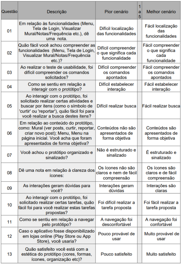 A Tabela 1 mostra a nota atribuída pelos participantes a cada questão do teste QUIS (Quadro 3), e o resultado foi positivo para o Melhor Cenário (entre 4 e 5), apenas a questão 13 (sobre a estética do protótipo: cores, formas, ícones, organização etc.) recebeu a menor nota (3) em comparação às outras, sendo uma questão pessoal de cada usuário. Sendo assim, o protótipo foi agradável e teve um bom uso da Qualidade em IHC para os voluntários, com isto, o objetivo do projeto, de usar a Qualidade em IHC para fazer um bom protótipo em relação a usabilidade e a experiência dos usuários, foi alcançado.