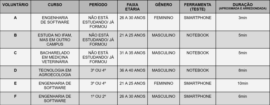 Os voluntários que fizeram pelo notebook tiveram dificuldade por conta da interface do Figma. Por exemplo, o protótipo não se ajustou ao tamanho da tela do equipamento, sendo necessário arrastar para visualizar toda a tela do aplicativo, e também recursos da interface do Figma atrapalharam a interação com o aplicativo. O teste pelo smartphone, também não se enquadrava corretamente a cada tela, mas era mais fácil de mover. Apenas um dos voluntários (E), que usou Smartphone, clicou acidentalmente e saiu da tela, fazendo o teste mais longo, porém não atrapalhou em si o andamento do teste, informações do perfil dos usuários, como também do tempo do teste está no Quadro 4.