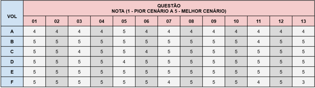 Legenda: VOL (Voluntário), as Questões são descritas no Quadro 3.