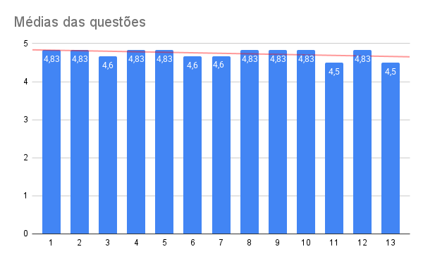 Por meio do Gráfico 1, que mostra a média de cada questão, percebe que ela varia entre 4,5 a 4,83. No teste QUIS o melhor cenário, ou cenário ideal, é a questão receber 4 ou 5. A média geral de todas as questões foi 4,83 de 5, ao observar a linha de tendência (vermelha) percebe-se que os valores ficaram uniformes. Por meio da média de cada questão e da média geral, o protótipo ficou no cenário ideal e teve um bom desempenho para os voluntários.