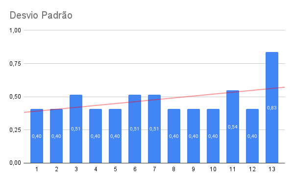 O desvio padrão compara se houve variação entre as notas dadas, quanto menor o desvio, mais homogêneo foi a pontuação. A questão que teve o maior desvio padrão foi a 13ª ficando com 0,83, como explicado anteriormente, esta questão era sobre a estética do protótipo, o que muda de usuário para o outro. Porém, todas as outras questões ficaram menores que 0,60 mostrando uma coesão entre as notas dadas. A média do desvio padrão de todas as questões foi 0,40.