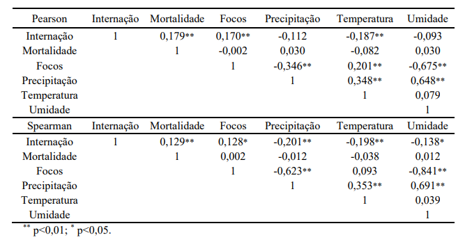 Em relação aos dados climáticos, a variável internação hospitalar apresentou correlação negativa e estatisticamente significativa com a temperatura do ar (Internação x Temperatura – Teste de Pearson -0.187, p-valor 0.004 e Teste de Spearman -0.198, p-valor 0.002), com precipitação (Teste de Spearman -0.201, p-valor 0.002) e umidade relativa do ar (Teste de Spearman -0.138, p-valor 0.03).