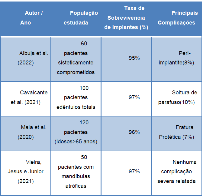As taxas de sucesso observadas na literatura são, em geral, superiores a 95% para a mandíbula e variam entre 90% e 95% para a maxila, dependendo da qualidade óssea e da adaptação da prótese (SOUZA et al., 2023; MARTINS et al., 2021). Estudos recentes indicam que a utilização de implantes com diâmetros maiores e superfícies aprimoradas tem contribuído para reduzir essa diferença, melhorando a estabilidade em ossos de baixa densidade (PEREIRA et al., 2023).