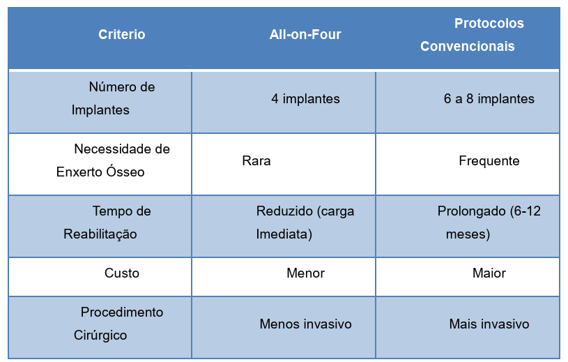 Tabela 1 – Apresenta as principais vantagens da técnica All-on-Four comparadas a protocolos convencionais