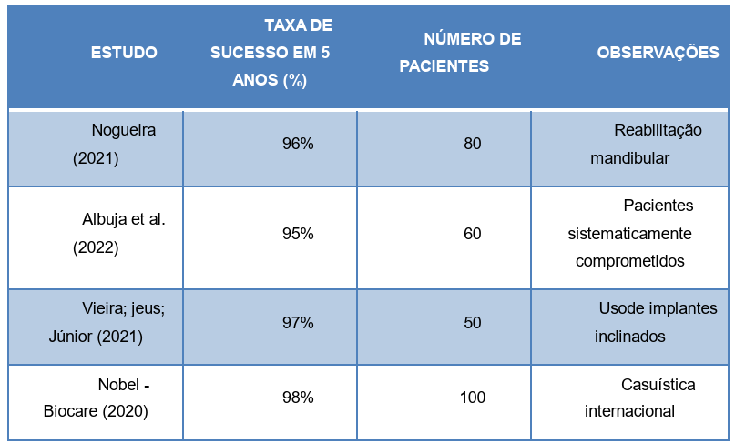 Diversos estudos demonstram altas taxas de sucesso da técnica All-on-Four. Segundo Nogueira (2021), a taxa de sobrevivência dos implantes após cinco anos é superior a 95%, semelhante ou até superior aos protocolos convencionais.