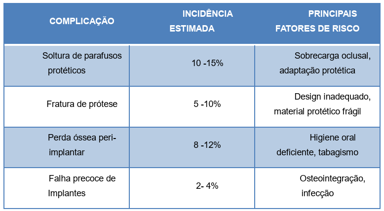 O controle rigoroso dos fatores de risco, a seleção criteriosa de pacientes e a orientação quanto à higiene oral são fundamentais para minimizar essas intercorrências.