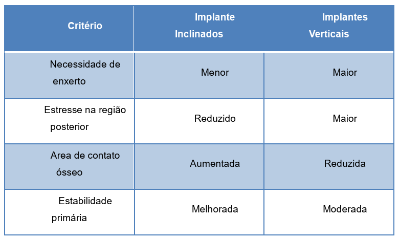 Assim, conclui-se que os implantes inclinados proporcionam maior previsibilidade em regiões de maior reabsorção óssea, sobretudo na mandíbula posterior.