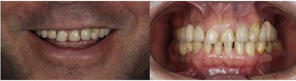 Na avaliação intraoral se observou restaurações insatisfatórias, desgastes incisais generalizados, abfrações, presença de implantes com coroas insatisfatórias nas regiões de 15, 14, 13, 22, 24, 25, 26, 27, coroa total confeccionada em metalo-cerâmica no dente 45 e ausência do dente 36, conforme ilustrado na Figura 2.