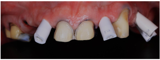 As peças foram provadas em boca para verificação da adaptação, após finalizar a conferência, as próteses sobre implantes das regiões correspondentes aos dentes 12 ao 15 e 22 foram cimentadas com adesivo (OptiBond FL, Kerr, Orange, Canadá, EUA) e cimento resinoso dual (Cimento Variolink Esthetic DC, Ivoclar, Barueri, SP) sobre os munhões personalizados, e na região dos dentes 24, 25 e 26 foi realizada uma prótese de 3 elementos parafusada sobre os implantes. As coroas totais dos dentes 16 e 17 seguiram mesmo protocolo de cimentação das próteses sobre implantes cimentadas e as facetas dos dentes 11, 21 e 23 foram cimentadas utilizando adesivo (OptiBond FL, Kerr, Orange, Canadá, EUA) e cimento resinoso fotopolimerizável (Cimento Variolink Esthetic LC, Ivoclar, Barueri, SP) (Figura 8).