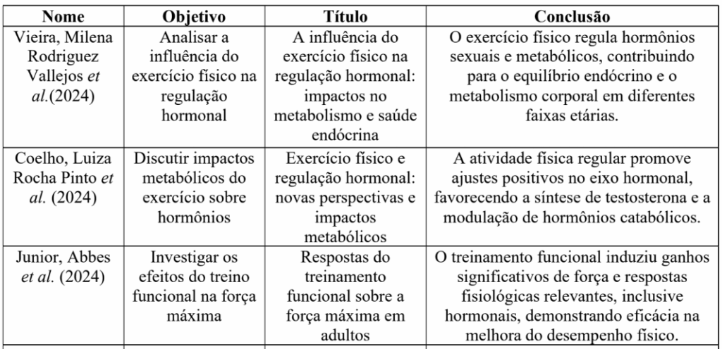 Os trabalhos analisaram desde a relações fisiológicas em atletas até os efeitos em indivíduos com condições clínicas específicas, contribuindo para uma compreensão mais ampla da modulação hormonal via exercício. A seguir, apresenta-se os principais dados extraídos dessas pesquisas, contemplando o nome dos autores, objetivo do estudo, título da obra e o respectivo ano de publicação (Tabela 1).