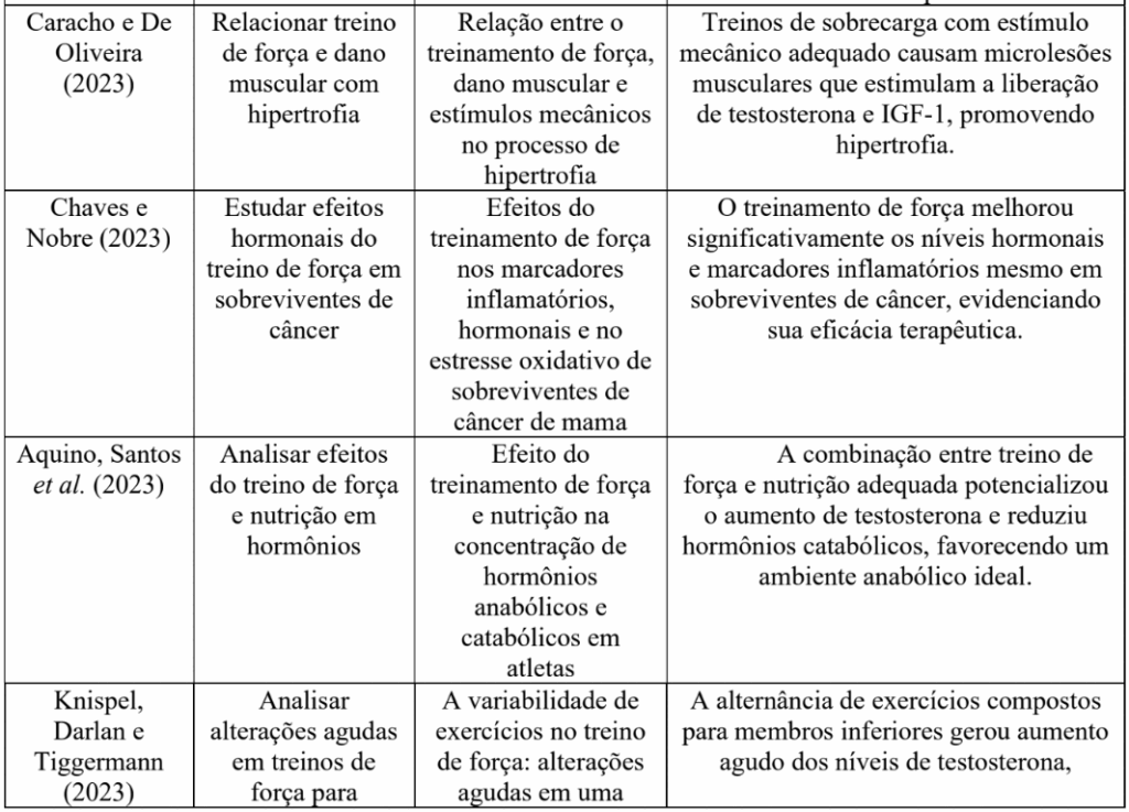 Chaves (2023), apresentou dados relevantes sobre os efeitos hormonais positivos do treinamento resistido em sobreviventes de câncer, ampliando a aplicabilidade terapêutica dessas práticas. Coelho et al. (2024), enfatizaram o papel do exercício físico na regulação hormonal e no impacto metabólico geral, aspecto fundamental para compreender as adaptações corporais.