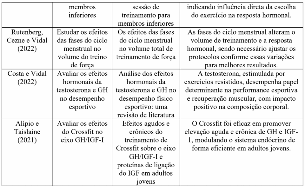 Junior et al. (2024), exploraram os benefícios do treinamento funcional sobre a força máxima, demonstrando um impacto direto sobre os mecanismos hormonais, enquanto Knispel e Tiggermann (2023), observaram alterações fisiológicas agudas específicas ao treinamento de membros inferiores. Neto (2021), examinou a interação entre testosterona e cortisol, ressaltando a importância do equilíbrio hormonal para a eficácia das adaptações musculares. Rutenberg, Cezne e Vidal (2022), investigaram as variações hormonais ao longo do ciclo menstrual, destacando a importância de ajustar os protocolos de treinamento conforme essas flutuações. Santos (2021), analisou alterações hormonais e de dano muscular em homens submetidos a diferentes programas de treino de força, enquanto Vieira et al. (2024), demonstraram que o exercício físico desempenha papel central na saúde endócrina e metabólica.