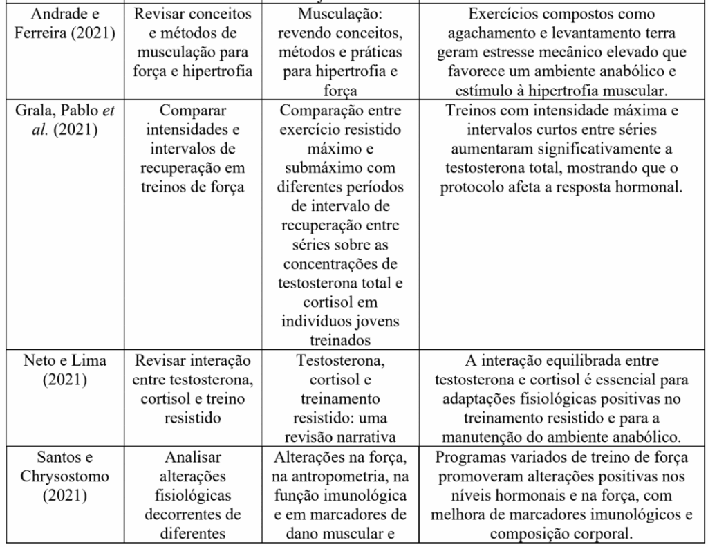 Costa (2022), reforçou o papel da testosterona na performance esportiva, destacando seu potencial na recuperação e no desempenho físico. Grala et al. (2021), investigaram diferentes intensidades de treino e intervalos de recuperação, demonstrando sua influência na modulação dos níveis de testosterona e cortisol. Guimarães, Alves e Lopes (2020), avaliaram a utilização do treinamento com oclusão vascular, evidenciando que essa técnica também pode gerar efeitos hormonais significativos, mesmo com cargas reduzidas.