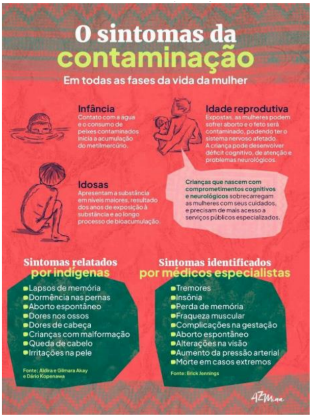 Referente aos efeitos da exposição durante a gestação, evidenciou-se que 67,4% de 86 entrevistadas referiram aborto, enquanto 8,3% de neonatos apresentaram malformação congênita e 13,9% dos nascidos-vivos apresentaram deficiência mental ou intelectual na primeira infância. O mercúrio é encontrado na natureza em duas formas: orgânica e inorgânica; a forma orgânica é mais hidrossolúvel e pode ser transferida diretamente ao feto por via transplacentária e ser secretada no leite; enquanto a forma inorgânica tende a se concentrar no líquido amniótico. O mercúrio possui efeitos deletérios e teratogênicos, justificados pelo estresse oxidativo e pela influência do mercúrio na rede de microtúbulos, que pode levar a um desarranjo na distribuição cromossômica durante a mitose. Assim, filhos de mães expostas a metilmercúrio podem apresentar retardo mental, paralisia cerebral e crises convulsivas, sendo especialmente prejudicial a exposição durante o período pré-natal (LI S, et al., 2022).