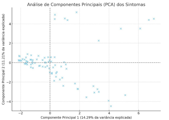 O gráfico de PCA representa uma técnica estatística que permite reduzir a dimensionalidade dos dados, condensando as informações de múltiplas variáveis em poucos componentes principais, facilitando sua interpretação. No eixo X é Componente Principal 1 (PC1) e no eixo Y é Componente Principal 2 (PC2), cada ponto no gráfico representa um indivíduo da amostra estudada, a proximidade ou agrupamento dos pontos indica similaridade nos perfis sintomatológicos entre os indivíduos e os pontos mais afastados sugerem indivíduos com perfis distintos de sintomas. Fonte: Do próprio autor.