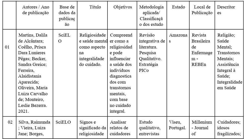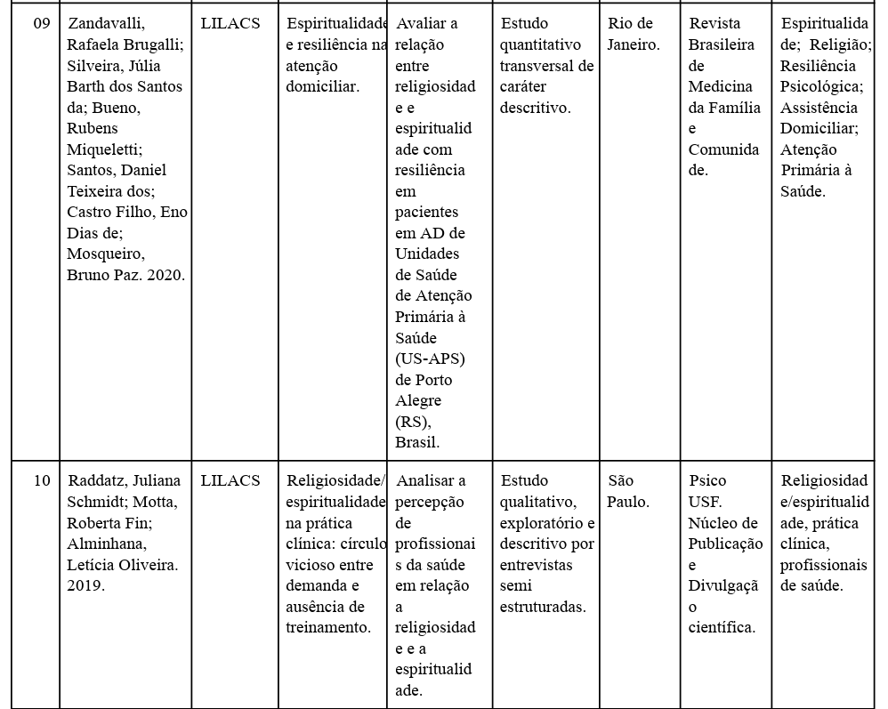 10- Martins, DA, Coêlho PDLP, Becker SG, Ferreira AA, Oliveira MLC, Monteiro LB. Religiosidade e saúde mental como aspecto na integralidade do cuidado. Amazonas: Revista brasileira de enfermagem – REBEn, 2021. Disponível em: https://doi.org/10.1590/0034-7167-2020-10