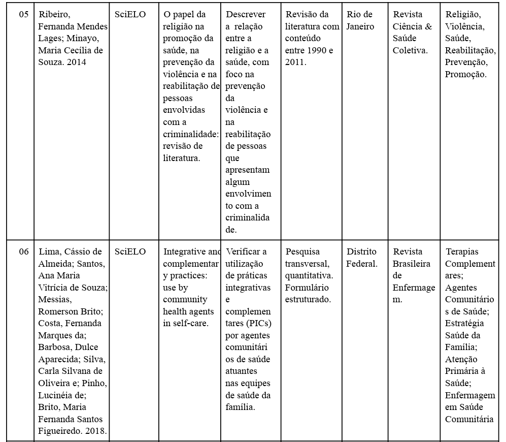O presente estudo realizou uma revisão integrativa de materiais presentes nas bases de dados da literatura como a Biblioteca Virtual em Saúde Scientific Electronic Library Online – SciELO, Literatura Latino-Americana em Ciências da Saúde – LILACS, Medical Literature Analysis and Retrieval System Online – MEDLINE (via Portal do CAPES) e Bases de Dados da Enfermagem – BDENF. A busca ocorreu entre julho e setembro de 2023 e optou-se pela linha temporal de achados materiais com visualização completa e gratuita produzidos entre 2012 e 2022. O estudo foi realizado como aprofundamento acerca da temática apontada sobre a influência da promoção de saúde desenvolvida em um terreiro da religião de matriz africana, o candomblé, neste caso, o terreiro localizado em Salvador – BA, o Ilê Axé Opô Afonjá, produzidos pela enfermeira e sacerdotisa Maria Stella de Azevedo Santos entre os anos de 1976 e 2018, discutido na dissertação de mestrado, intitulada, Maria Stella de Azevedo Santos: enfermeira e sacerdotisa na promoção da saúde, apresentada à Universidade Federal do Estado do Rio de Janeiro.