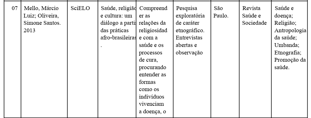 12- Mello ML, Oliveira SS. Saúde, religião e cultura: um diálogo a partir das práticas afro-brasileiras. São Paulo: Revista saúde e sociedade, 2013.