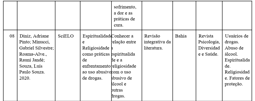 13- Diniz AP, Minucci GS, Roama A, Rauni J, Souza LP. Espiritualidade e religiosidade como práticas de enfrentamento ao uso abusivo de drogas. Bahia: Revista psicologia, diversidade e saúde, 2020. Disponível em: https://doi.org/10.17267/2317-3394rpds.v9i1.2467