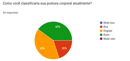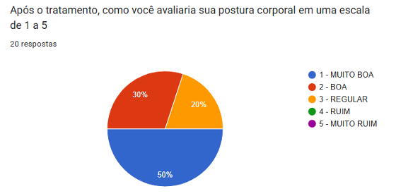 Observamos que 50% dos participantes avaliaram sua postura corporal como “muito boa” após o tratamento, 30% como “boa” e 20% como “regular” não havendo avaliação “ruim” ou “muito ruim”. Esses resultados indicam melhora perceptível na autoavaliação postural após o tratamento aplicado.