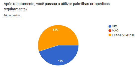 O gráfico mostra que 45% dos participantes passaram a utilizar palmilhas ortopédicas regularmente após o tratamento, enquanto 55% utilizam apenas ocasionalmente. Segundo DOS SANTOS PASTILHA. (2021), a adesão ao uso de palmilhas ortopédicas tende a variar entre 40% e 60% após o tratamento inicial, sendo influenciada principalmente pelo conforto percebido e pela melhora dos sintomas.