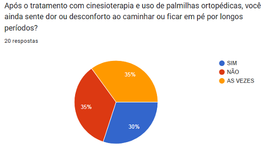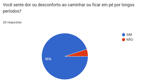 Após o período de intervenção, observou-se uma redução considerável nos relatos de dor e desconforto durante a marcha ou permanência em pé. Conforme ilustrado na Figura 4, 35% dos participantes afirmaram não sentir mais dor, 35% relataram sentir apenas às vezes e apenas 30% ainda apresentaram algum desconforto. Esses resultados indicam melhora significativa em relação à pré-avaliação, na qual 95% dos participantes relataram dor constante.