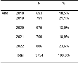 Ao total foram realizadas 3.754 cirurgias de revascularização miocárdica no Norte do Brasil entre 2018 e 2022. A realização das cirurgias apresentou uma distribuição anual que variou de 18,0% a 23,6% ao longo do período de 2018 a 2022, com um aumento significativo em 2022, representando 23,6% das cirurgias do período estudado (Tabela 1).