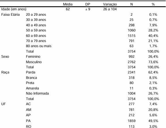 A idade média dos pacientes submetidos à cirurgia foi de 62 anos, com um desvio padrão de ± 9, variando de 26 a 104 anos, e com predominância na faixa etária de 60 a 69 anos, que representa 40,4% dos casos. Observa-se uma predominância masculina (73,6%) e de pessoas pardas (62,4%). A distribuição dos pacientes por estados mostra uma proporção maior no estado do Pará, que representou 49,5% dos casos. Não há dados quanto a cirurgias no estado de Roraima. (Tabela 2)