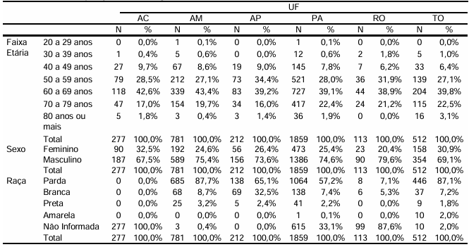 Em relação ao gênero, a maior proporção de pacientes do sexo masculino foi notada em Rondônia (79,6%), enquanto a maior proporção de pacientes femininos foi encontrada no Acre (32,5%). Quanto à distribuição racial, há uma predominância de pacientes pardos, especialmente no Amazonas (87,7%) e no Tocantins (87,1%). Acre e Rondônia apresentaram uma alta porcentagem de dados não informados (100% e 87,6% respectivamente). (Tabela 3).