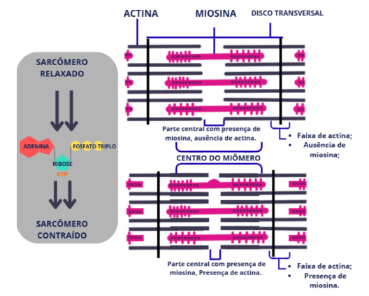 Após este estímulo, ocorre a interação entre duas proteínas contráteis, denominadas actina e miosina (Figura 7), que graças a presença de íons como cálcio e magnésio, tornam possível o deslizamento de filamentos gerando então a contração. Para ocorrer a contração existe uma energia que é gerada graças a hidrólise de ATP, que por sua vez é reproduzida através de processos bioquímicos como Ciclo de Krebs (LEVY; DIAMENT; SARAIVA.,1960).