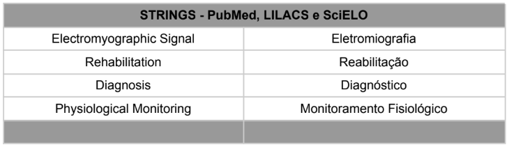 No presente contexto, foram adotados como descritores oficiais determinado pelo DeSC e MeSH os seguintes termos “Electromyography/Eletromiografia”, “Rehabilitation/Reabilitação”, “Diagnosis/Diagnóstico”, “Physiological Monitoring/Monitoramento Fisiológico” e “Biomechanics/Biomecânica”, garantindo compatibilidade com o padrão de indexação das bases consultadas (Tabela 1), além de utilizar a String Livre “Brazil” como uma opção para delimitação nacional dos artigos, entretanto ainda sendo necessário a leitura do resumo para entender o contexto do “Brasil” na pesquisa.