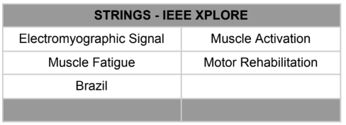 Entre elas destacam-se “Electromyographic Signal”, “Muscle Activation”, “Muscle Fatigue” “Motor Rehabilitation” (Tabela 2). A inclusão desses termos amplia a sensibilidade da busca, considerando que grande parte da literatura científica, especialmente em bases tecnológicas como IEEE Xplore, utiliza terminologias específicas que não são necessariamente reconhecidas pelos vocabulários biomecânicos tradicionais.