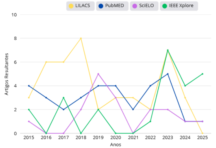 As buscas das produções científicas foram realizadas em quatro bases de dados: SciELO, LILACS, PubMed e IEEE Xplore. A base SciELO foi selecionada por sua relevância como repositório de periódicos científicos brasileiros, possibilitando o acesso à produção nacional na área da saúde. A LILACS foi incluída por ampliar a cobertura da literatura latino-americana e do Caribe em Ciências da Saúde, com o apoio do vocabulário controlado Descritores em Ciências da Saúde (DeCS).