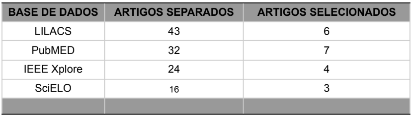 A tabela 1 apresenta os resultados da aplicação dos filtros após seleção de artigos, 20 artigos foram separados para análise, sendo eles: LILACS com 6 artigos selecionados, PubMED 7 artigos selecionados, SciELO 3 artigos selecionados e IEEE Xplore com 4 artigos selecionados.
