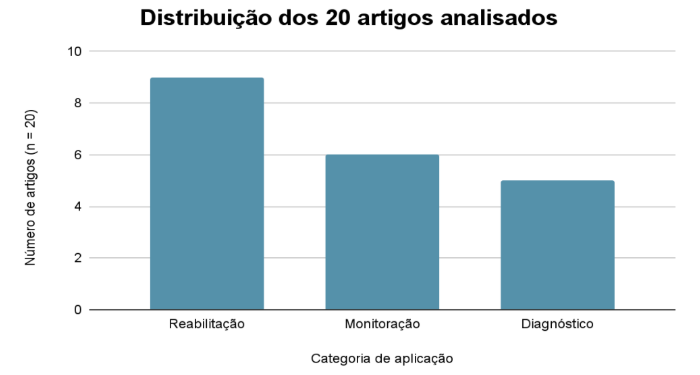 O gráfico 2 apresenta a distribuição dos 20 artigos analisados por categoria de aplicação, obtendo-se: Reabilitação a 9 artigos (45%), monitoração com 6 artigos (30%) e diagnóstico com 5 artigos (25%).