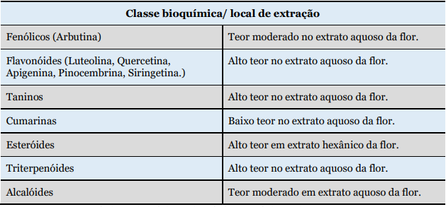 Conforme observado na tabela 2, este táxon é conhecido por possuir em sua composição compostos que são de grande importância para a fitoterapia, tais como: arbutina, luteolina, quercetina, apigenina, pinocembrina e siringetina (KUMAR et al., 2005). Para Lima (2013) a arbutina é citada para o tratamento de infecções no trato urinário, a quercetina está presente em compostos usados para tratar distúrbios vasculares e a apigenina utilizada para tratar inflamações. A presença de cumarinas indicam um alto potencial antioxidante (Dias, 2015). Santos et al. (2010) dizem que os alcalóides, tem atuação anticolinérgica, emética, antimalárica, antihipertensiva, hipnoanalgésica, amebicida, estimulante do SNC, antiviral, miorrelaxante, anestésica, antitumoral, antitussígena, colinérgica, dentre outras.