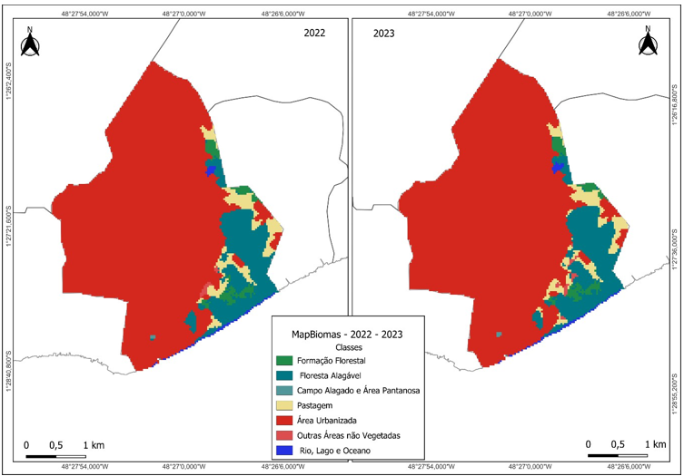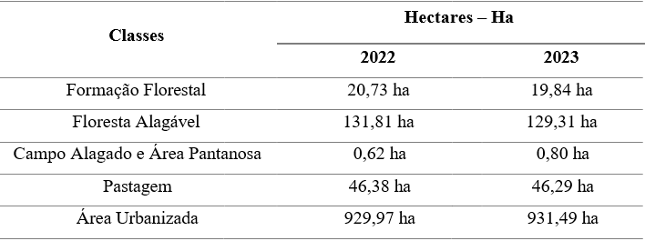 No ano de 2022 e 2023 figura 3, a área urbana teve um crescimento significativo abrindo caminho para uma nova classe, a não vegetada, fazendo com que a formação florestal perdesse cerca de 17 hectares (tabela 2) do seu espaço vegetal em comparação com o ano de 2001. Avaliando as mudanças do uso do solo durante o longo período, a floresta alagável e área pantanosa tiveram uma redução ao comparar a tabela 1 e 2.