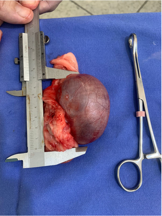 A paciente foi classificada como ASA II, condizente com doença sistêmica leve a moderada e controlada. O protocolo anestésico incluiu acepromazina (0,4 mg, IM) e tramadol (1,6 mg, IM) como medicações pré-anestésicas, seguidos de indução e manutenção anestésica com cetamina e midazolam. A analgesia trans e pós-operatória foi assegurada com tramadol, em conformidade com estratégias de analgesia multimodal. A abordagem cirúrgica consistiu em celiotomia exploratória, realizada por incisão de aproximadamente 8 cm na linha alba, caudalmente à cicatriz umbilical. Os achados intraoperatórios confirmaram a presença de ovário remanescente no antímero direito (Figura 1), envolvido por cisto de grandes dimensões, enquanto o coto uterino encontrava-se aderido à superfície ventral da bexiga. O complexo arteriovenoso ovariano foi ligado com fio absorvível sintético nº 0, e o coto uterino recebeu ligadura transfixante aplicada o mais caudalmente possível, imediatamente cranial à cérvix, seguida de ligadura adicional de segurança. Antes do fechamento da cavidade abdominal, realizou-se lavagem abundante com solução fisiológica aquecida a 0,9% e omentopexia na região do corpo uterino. A síntese ocorreu por três planos: linha alba em padrão simples contínuo com poliglecaprone 25 nº 2-0, subcutâneo em padrão intradérmico com poliglecaprone 25 nº 2-0 e pele em padrão Wolf utilizando fio de nylon nº 3-0.