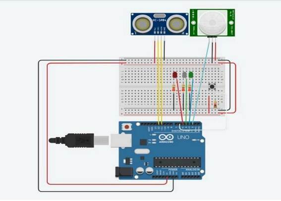 O sistema foi construído a partir de componentes eletrônicos de baixo custo, com o objetivo de tornar o projeto acessível e de fácil replicação. Foram utilizados um microcontrolador Arduino Uno R3, uma protoboard, três LEDs (vermelho, verde e branco), resistores de 220 Ω e 1 kΩ, um push button, um sensor PIR, um sensor ultrassônico HC-SR04 e cabos jumper. Cada componente foi selecionado de acordo com sua função no sistema e com a viabilidade técnica e econômica de aplicação.