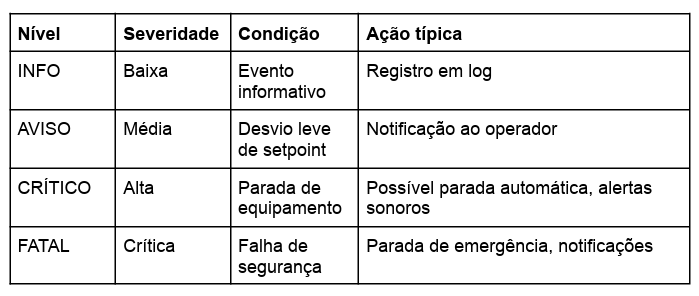 Conforme descrito pela norma IEC 62682 (2015), que estabelece diretrizes para gestão de alarmes, um sistema adequado de alarmes deve ser hierarquizado, com diferentes níveis de severidade e ações correspondentes.